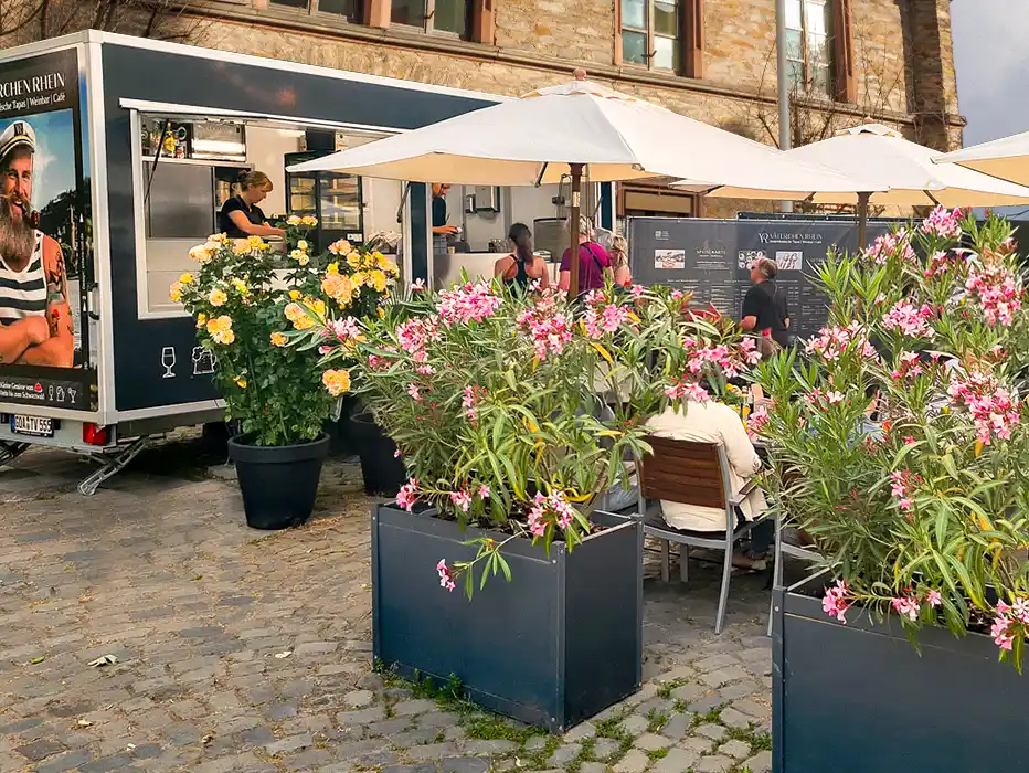 Väterchen Rhein on Tour mit VR goes Pop-Up – Mobile Genussmomente für Dein Fest. Ab sofort bringen wir unsere Spezialitäten direkt zu Euch! Mit unseren flexiblen Food-Ständen (10 qm & 15 qm) versorgen wir Euch mit leckeren Tapas, kleinen Speisen und Euren Lieblingsgetränken. Ob Firmenfeier, Hochzeit oder Straßenfest – wir sind am Start! Jetzt unverbindlich anfragen!