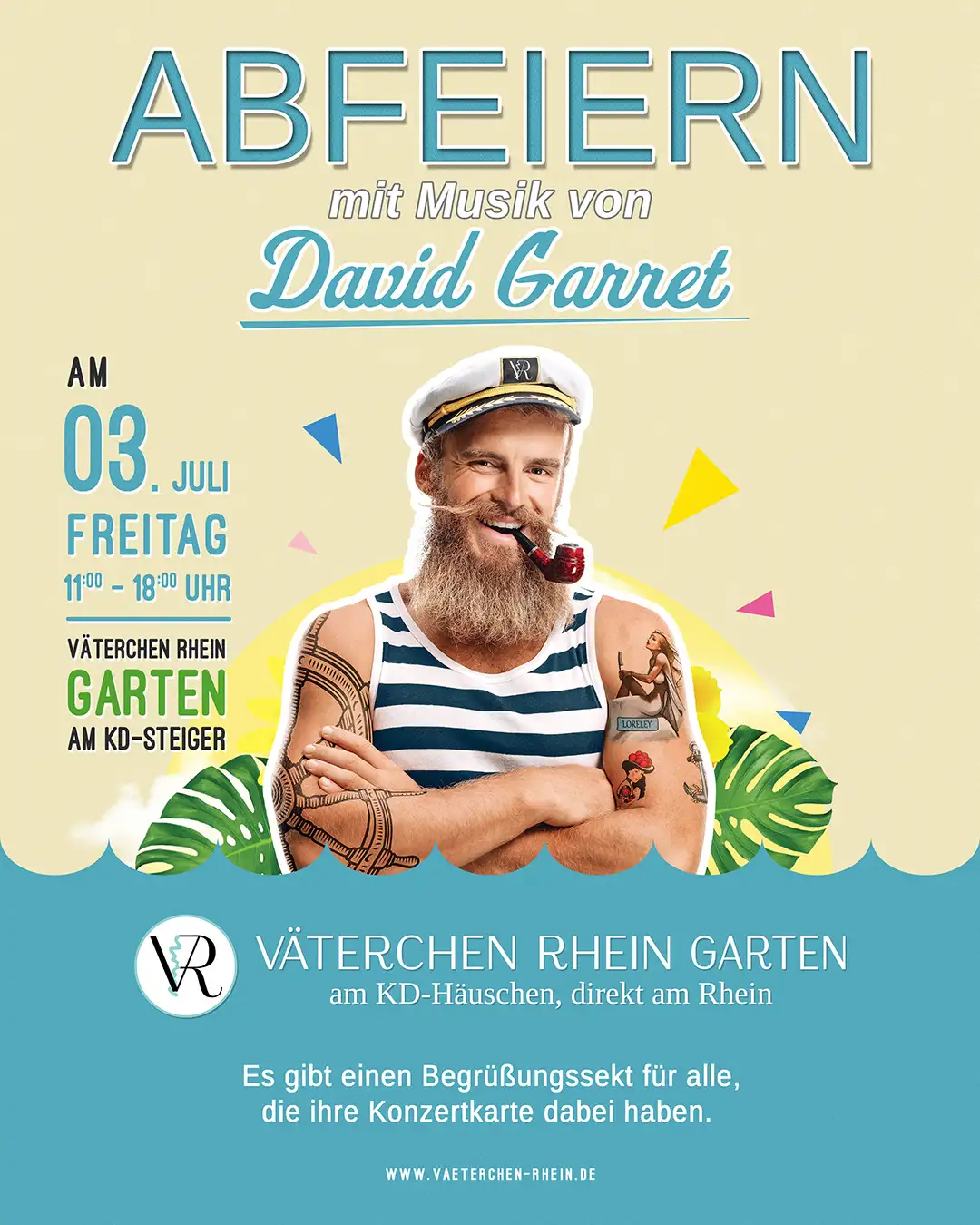 3. Juli @ 11:00 - 18:00 David Garret – Abfeiern am 03.07. Väterchen Rhein Garten Väterchen Rhein Garten, In den Rheinanlagen 1 (am KD-Steiger), Oberwesel, Germany Free